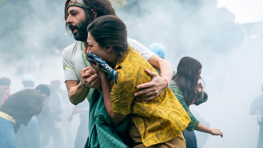 "When a peaceful protest at the 1968 Democratic Convention turned violent, the whole world was watching. This new drama from Aaron Sorkin, which includes an incredible cast—Sacha Baron Cohen, Joseph Gordon-Levitt, Eddie Redmayne and Michael Keaton—details the trial that followed those events. The powerful trailer unravels the narrative, but it's the sound mixing that keeps viewers on edge. The chanting reminder that "The whole world is watching" transports you into the movement. The poster design smartly demonstrates the subject matter while also speaking volumes to current events and the civil division. See The Trial of the Chicago 7 on Oct. 16."